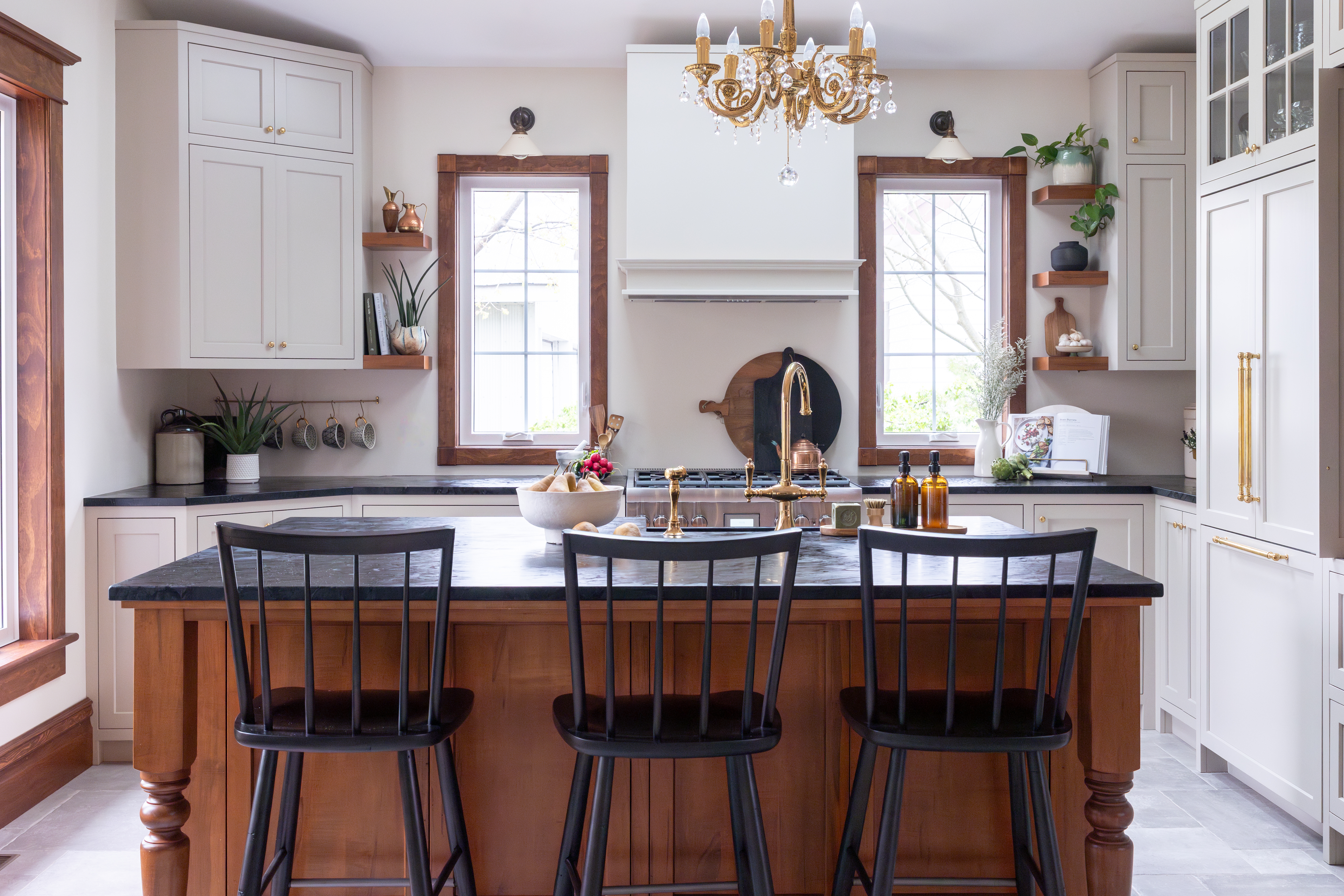 A traditional kitchen and mudroom in Listowel built with inset faceframe construction and a soapstone countertop with an integrated soapstone sink. The kitchen includes custom island posts and integrated fridge, freezer, and dishwasher panels. The mudroom features a solid wormy maple shoe rack, a wormy maple bench seat, and classic door profiles with decorative air holes.